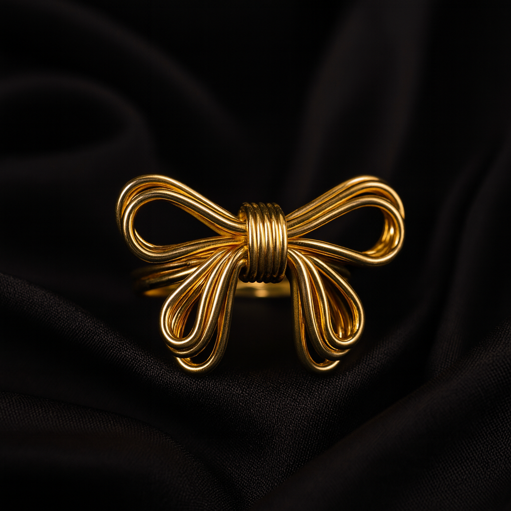 Add a playful yet elegant touch to your style with the Bowtie Statement Open Ring. Designed with delicately looped golden wires, this ring forms a charming bowtie shape that instantly draws attention. The open-ended design makes it comfortable to wear and easy to adjust, ensuring a perfect fit for any finger. Pair it with your casual outfits for a quirky edge or with evening wear to add a touch of sophistication. Lightweight and eye-catching, this ring is perfect for those who love jewelry that’s as unique as they are.