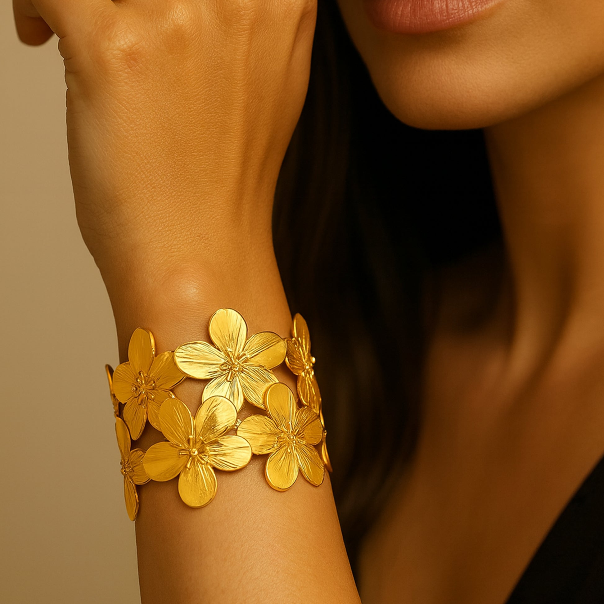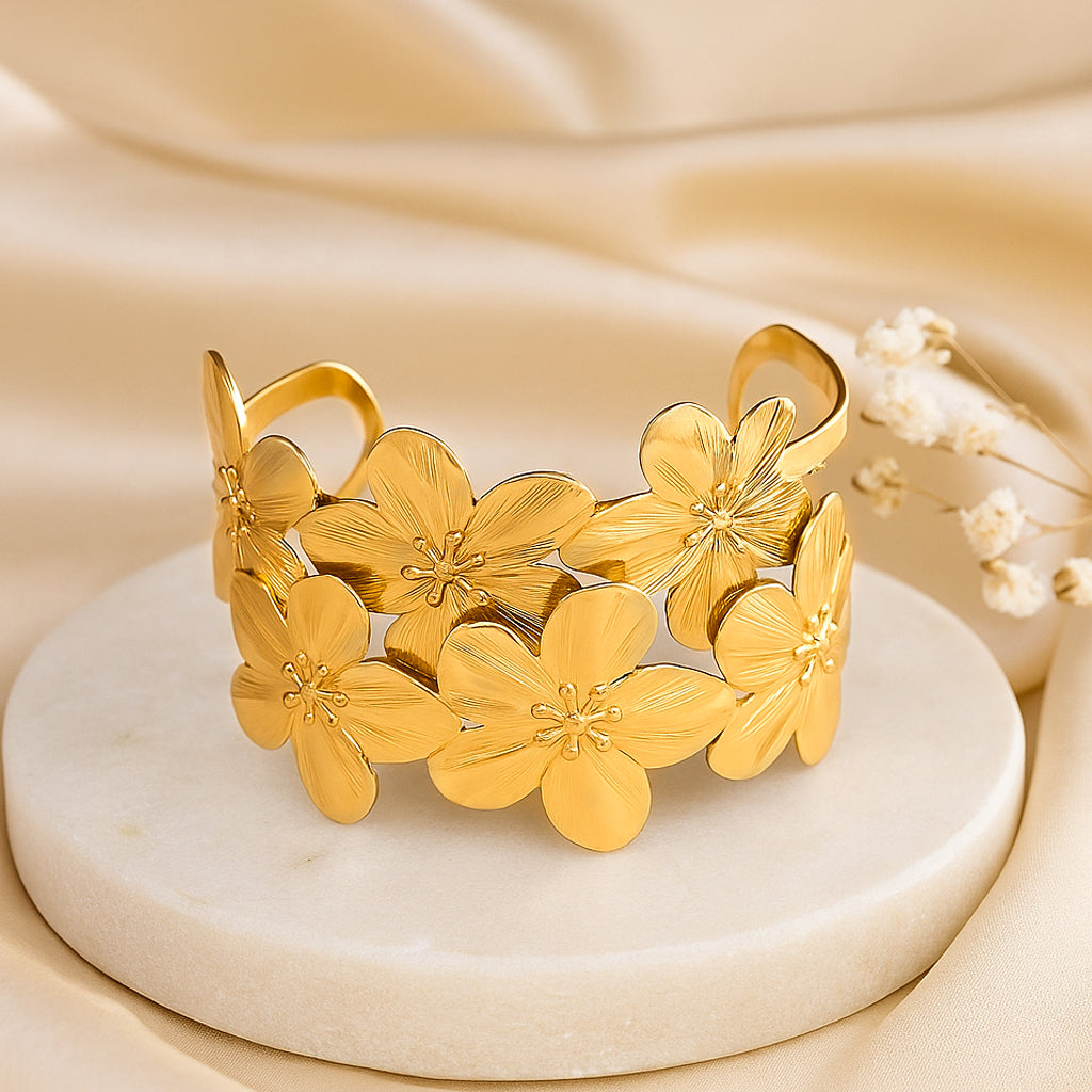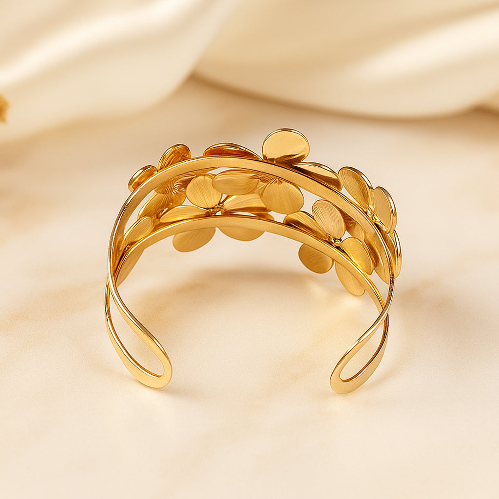 The Floral Golden Statement Cuff with blooming petals crafted in a shiny gold finish, brings charm, elegance, and a whole lot of personality to any outfit. It’s wide enough to stand out, yet light enough to wear all day.