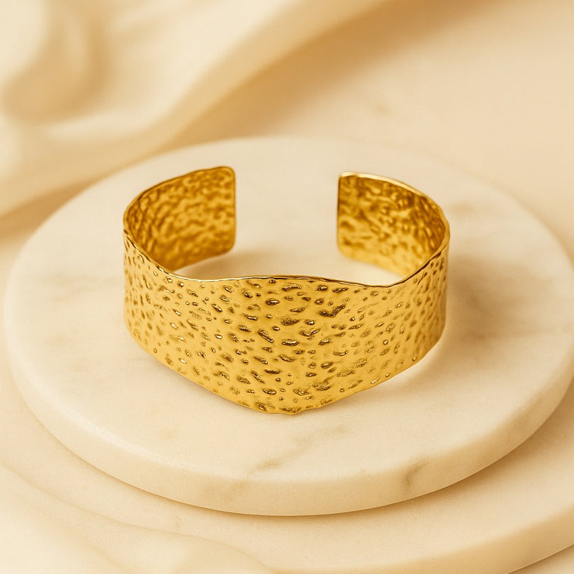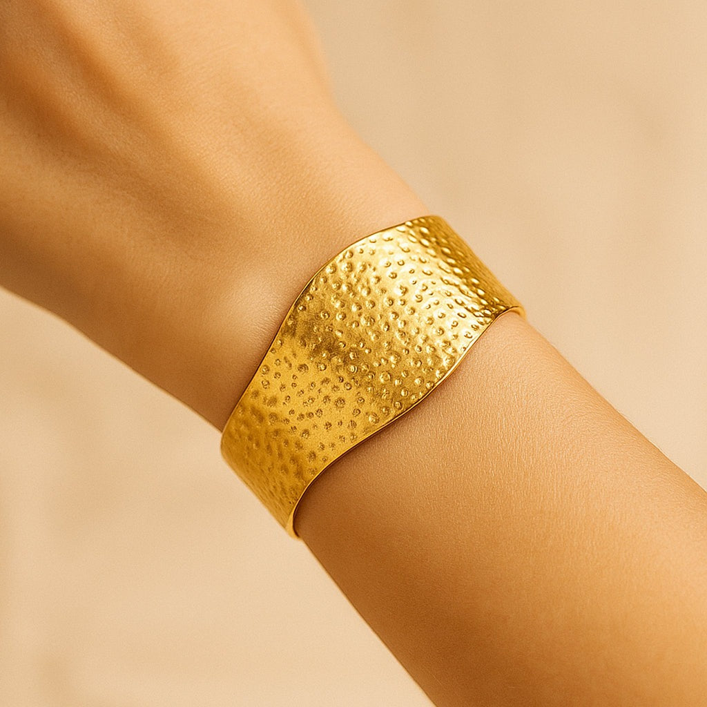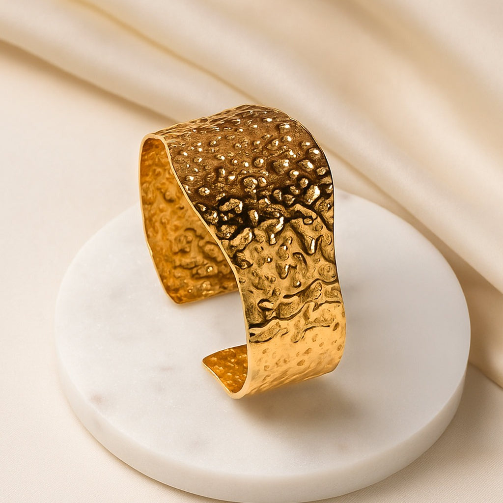 Make a bold yet easy statement with the Gold Hammered Statement Cuff. This wide cuff features a beautifully textured, hammered finish that gives it a raw, handcrafted look.