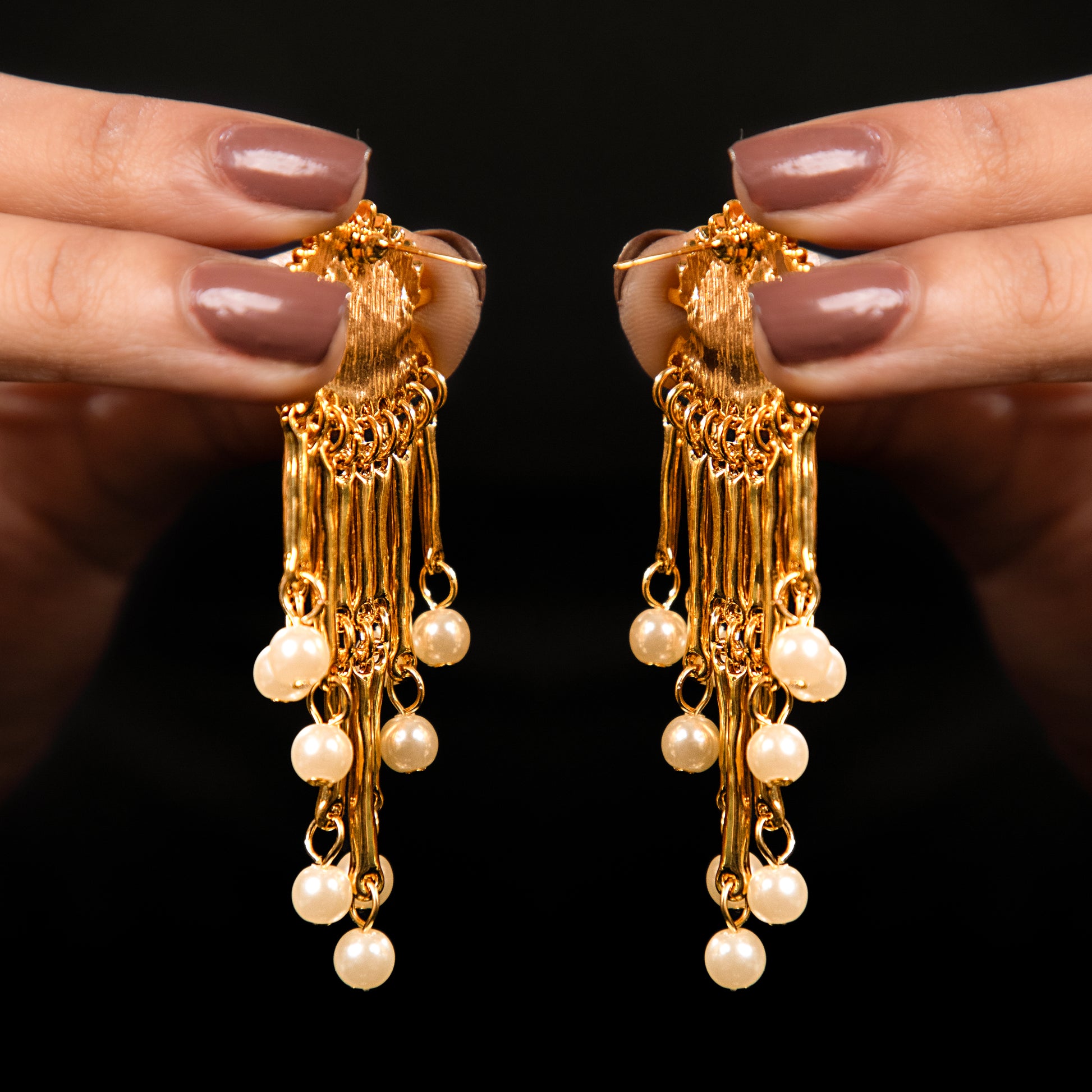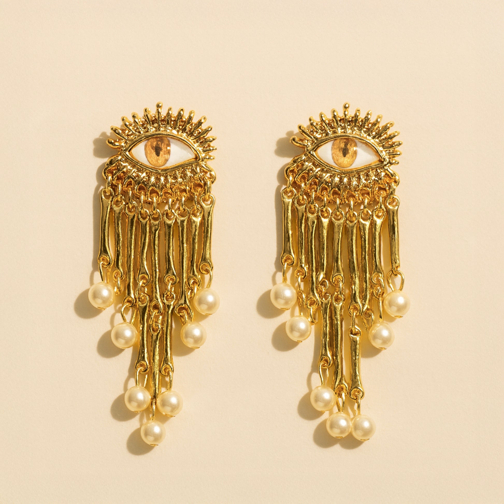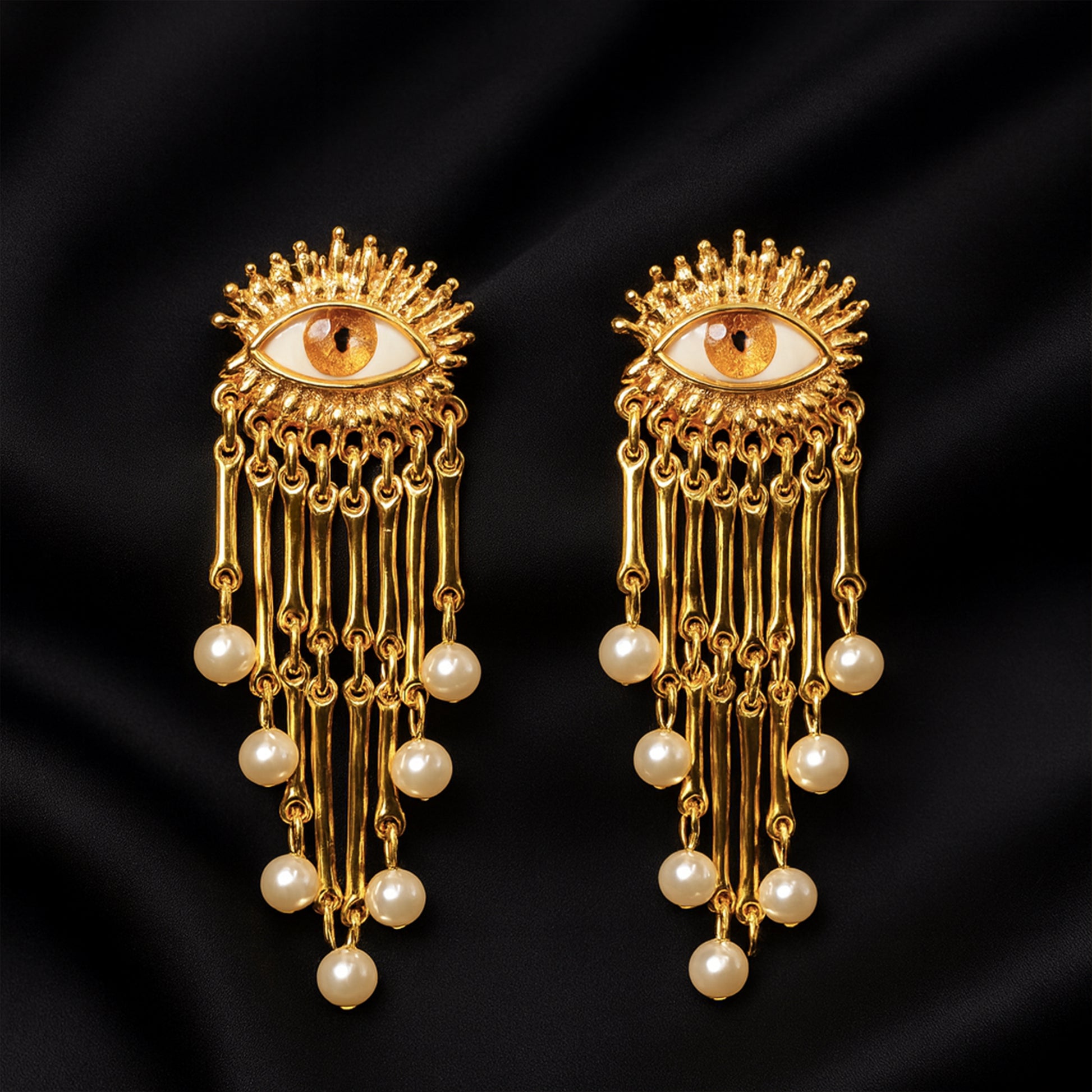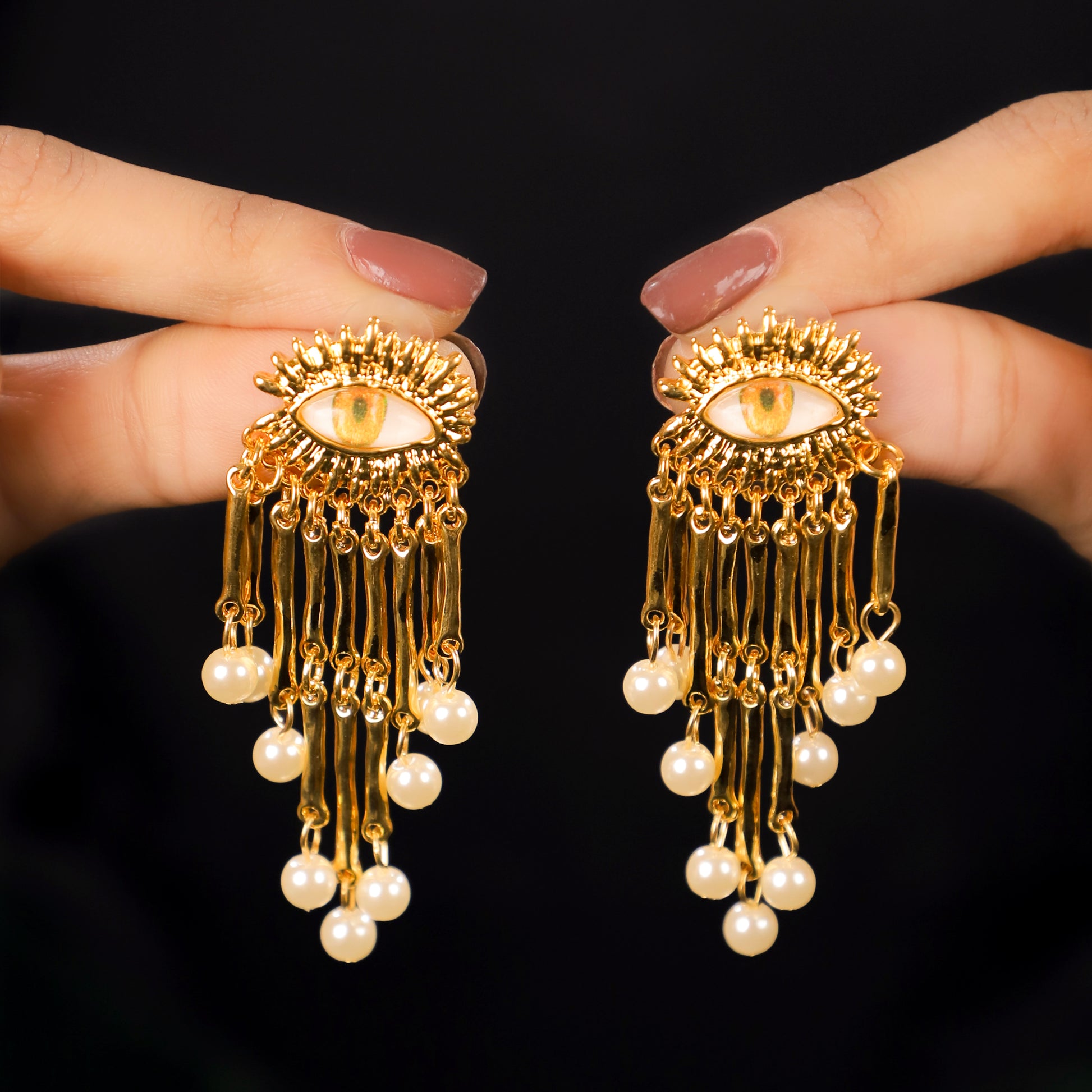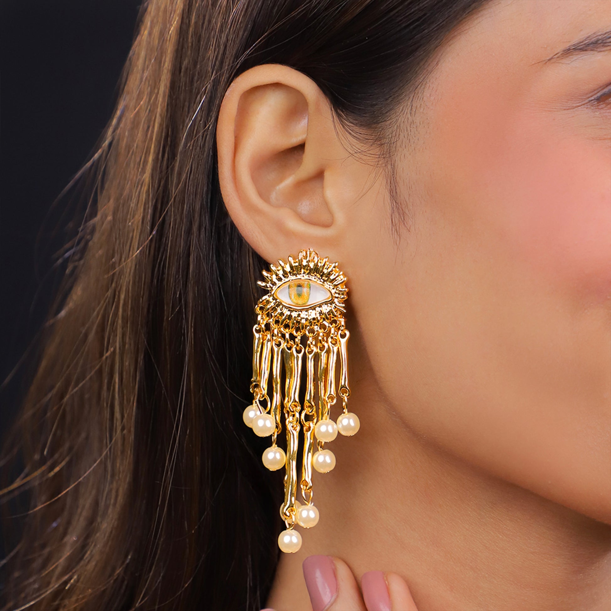 The Golden Gaze Statement Dangler Earrings feature a unique eye-inspired motif at the top, cascading into delicate golden fringes adorned with petite pearl drops. The blend of shimmering gold tones and soft pearlescent accents adds a sophisticated touch, making them a standout accessory for evening wear, festive celebrations, or special occasions. Bold yet elegant, these danglers are perfect for those who love jewelry that is charming, artistic, and impossible to overlook.