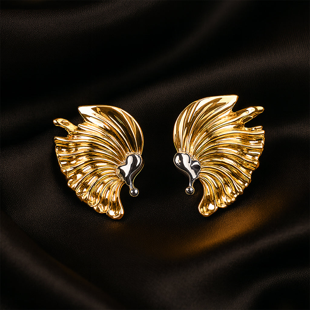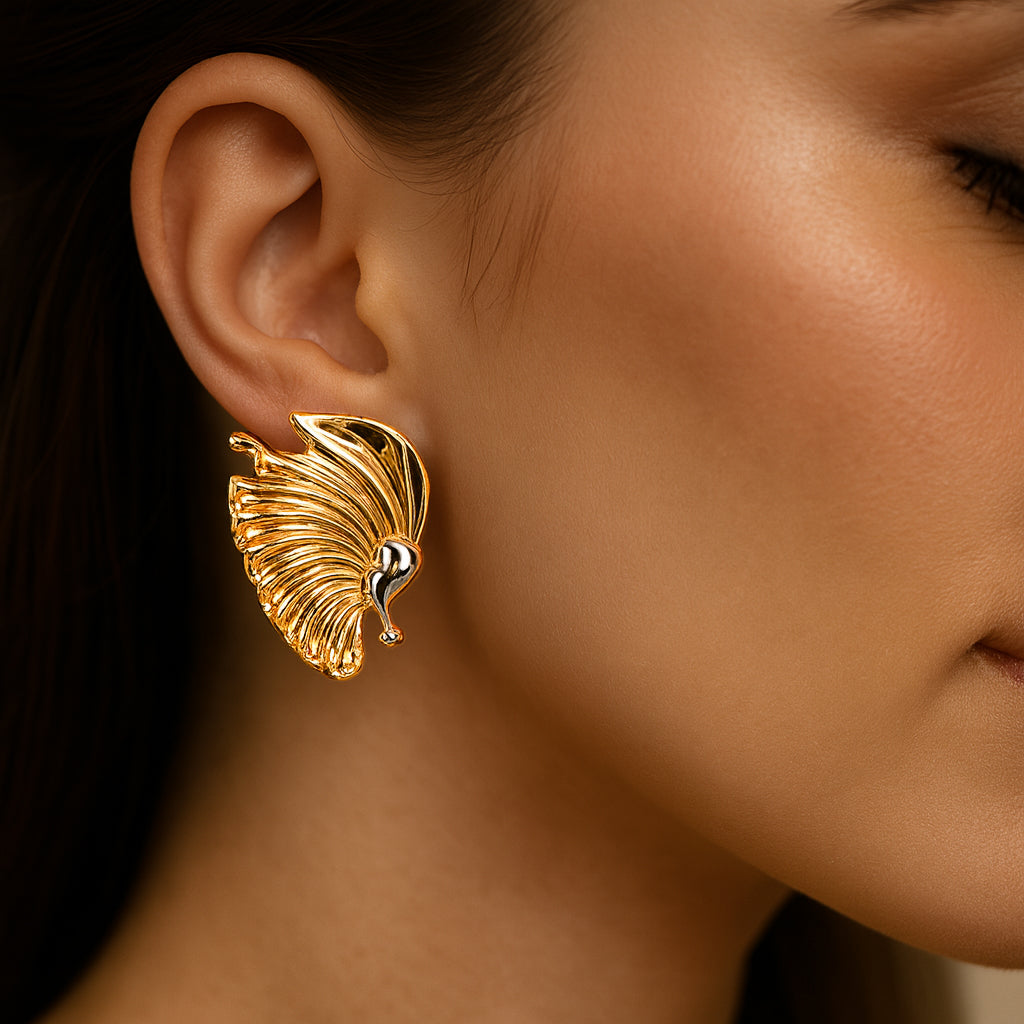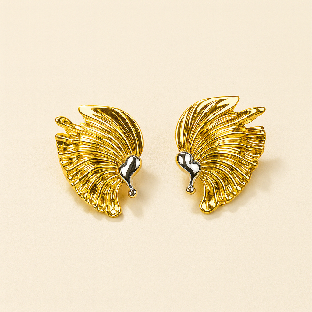 The Golden Halos Stud Earrings bring you a sculpted, wing-like silhouette that creates a radiant halo effect, catching the light with every movement. Crafted in high-shine gold finish, these studs make an instant statement while remaining versatile enough for everyday wear. The intricate detailing adds depth and dimension, giving them a luxurious, high-fashion feel. Perfect for elevating a simple outfit or adding an extra layer of sophistication to an evening look.