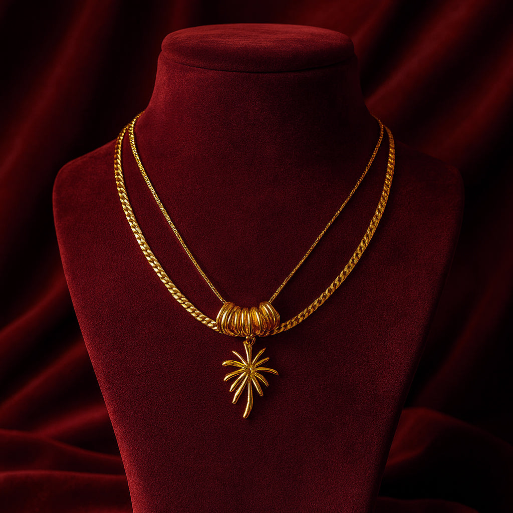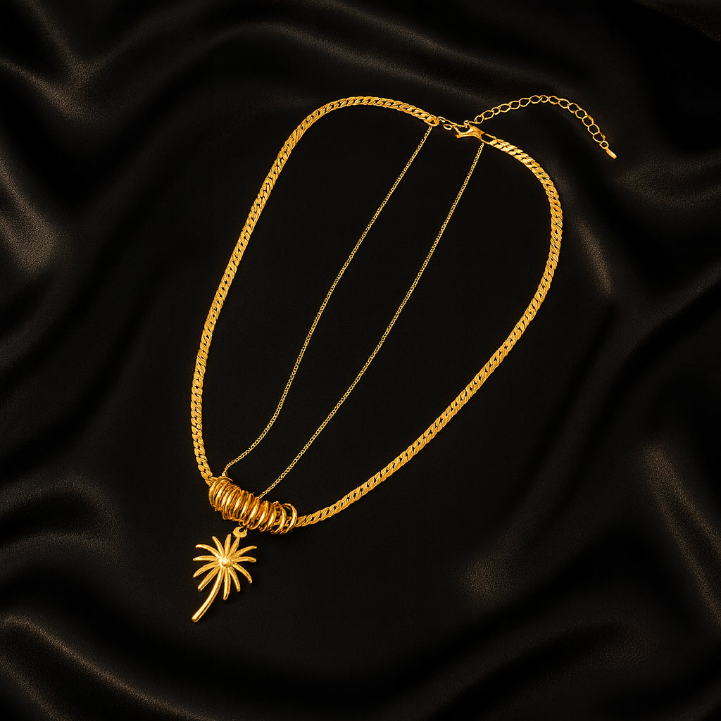 Elevate your style with Golden Palm - a multi-layered necklace featuring a bold palm tree motif, perfect for the trendsetter who loves a touch of tropical edge. Crafted from premium, lightweight, and skin-friendly materials, it offers all-day comfort without compromising on flair. Whether layered or worn solo, this statement piece effortlessly blends modern sophistication with laid-back vacation vibes. Make waves wherever you go!