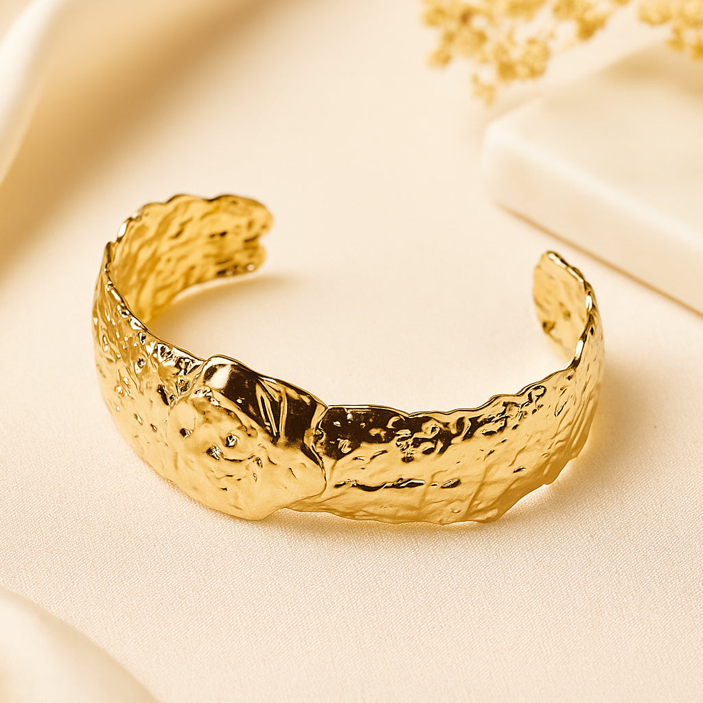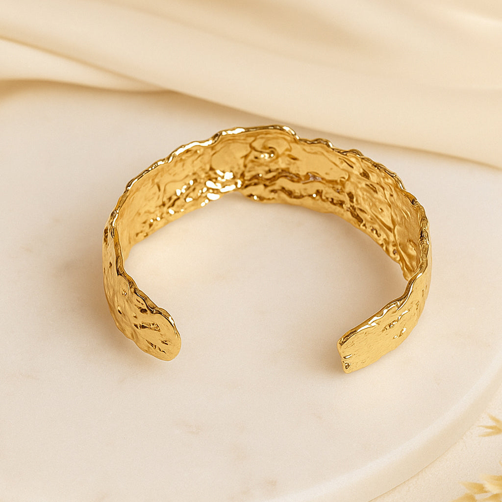 This one’s all about texture - bold, raw, and beautifully imperfect. The Golden Reef Cuff has a rough, reef-inspired finish that gives it a natural, earthy vibe while still feeling super luxe in gold. It’s chunky but comfortable, and instantly adds depth to even the simplest outfits.