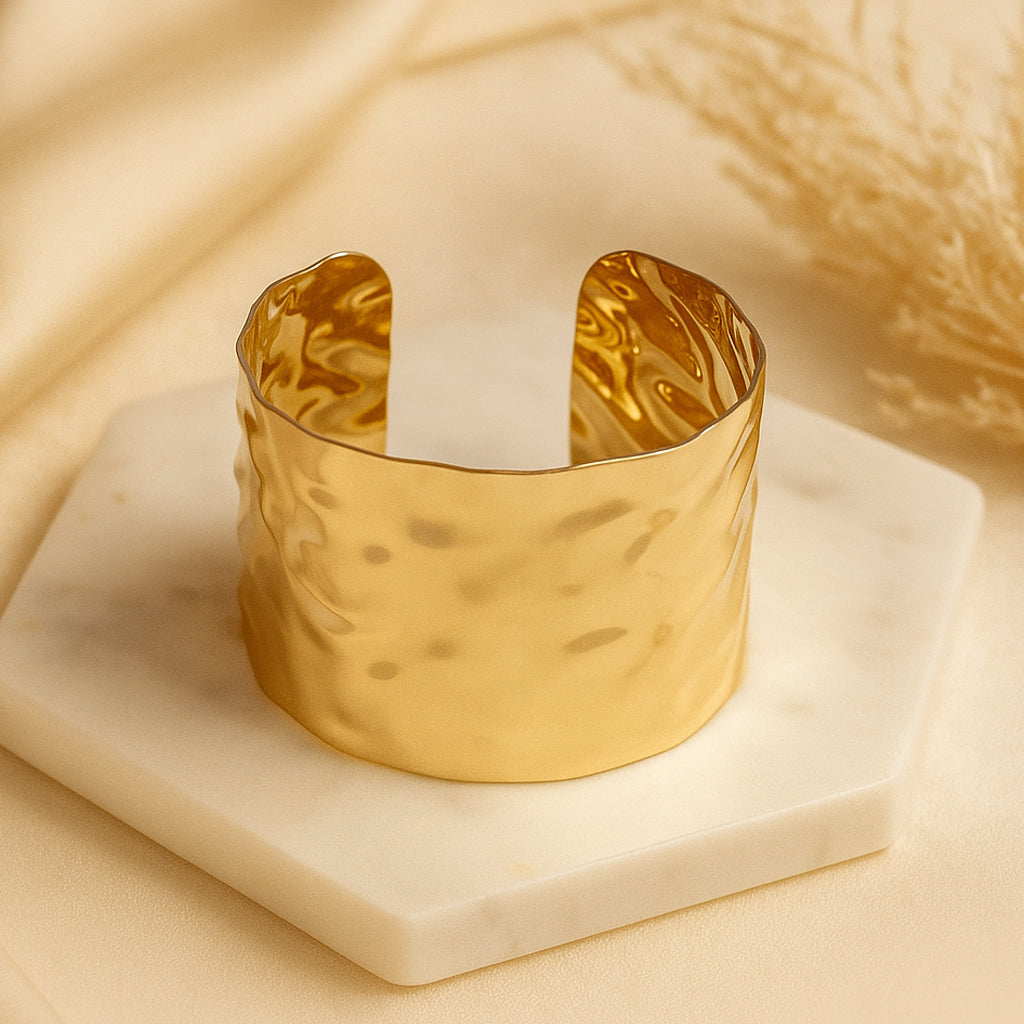 Simple, bold, and full of character, the Golden Ripple Cuff Bracelet is a real standout. Its lightly hammered texture gives it that natural ripple effect, catching the light in just the right way while the wide, slip-on design makes it comfortable to wear all day.