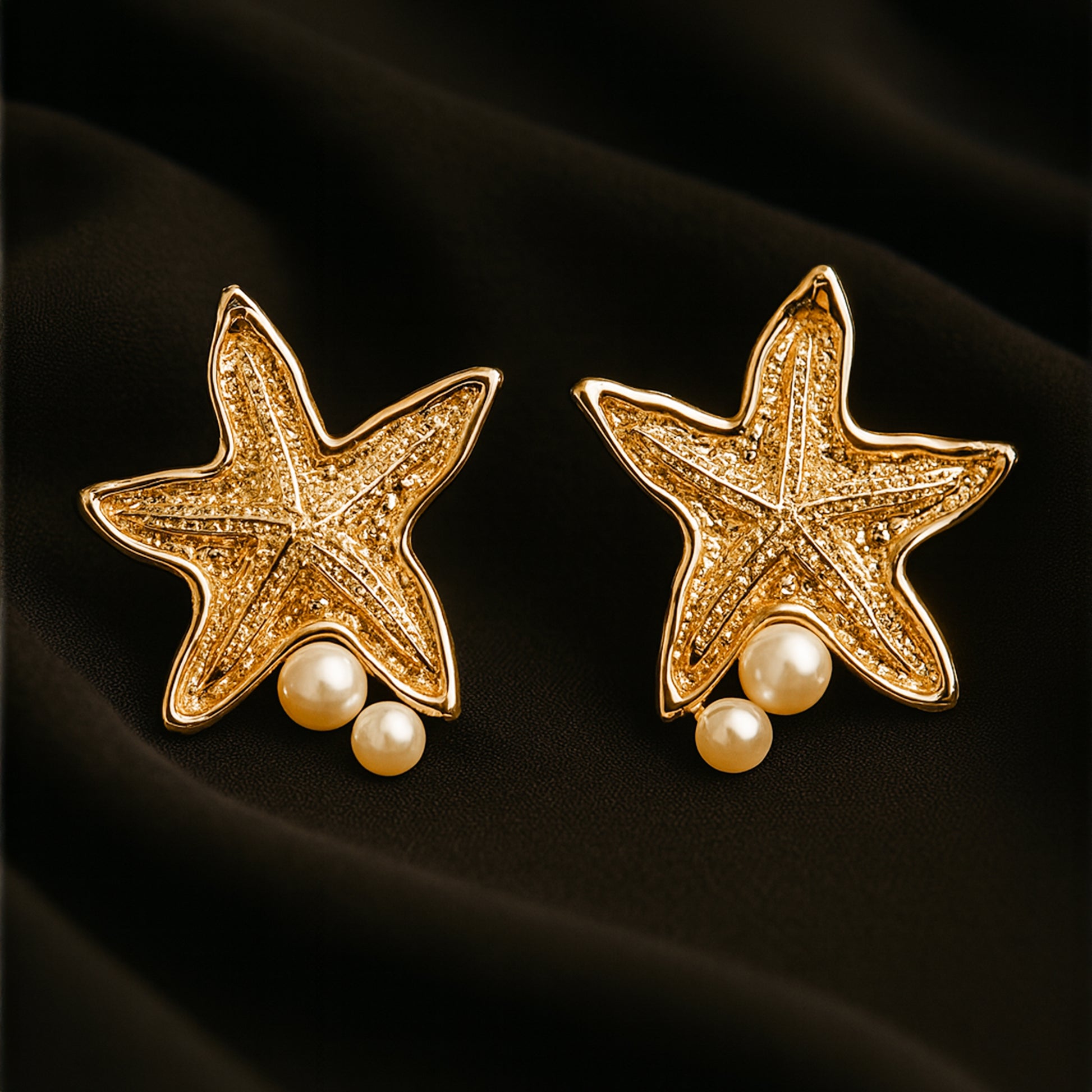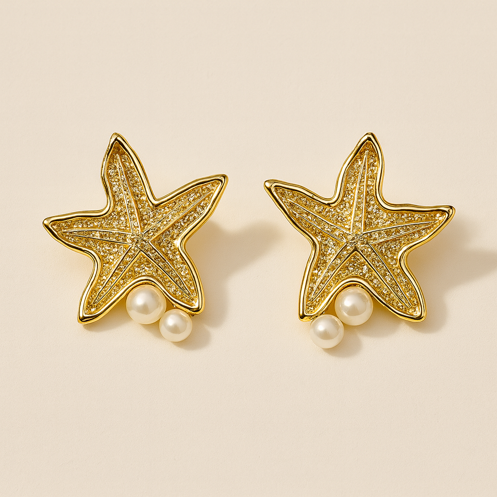 Bring a touch of sunlit shores and serene sea breezes, with these Golden Starfish & Pearl Studs. Designed with intricate detailing, the textured golden starfish evokes the beauty of the ocean, while the dainty white pearls add a soft, timeless charm. Lightweight and comfortable, these studs are perfect for both everyday wear and special occasions, making them a versatile addition to your jewelry collection. Pair them with breezy dresses for a beachy vibe or with classic attire for a subtle statement.