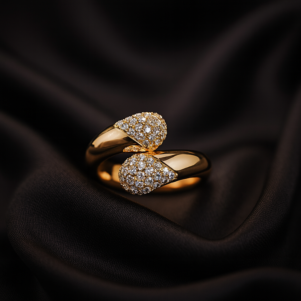 The Lustre Wrap Ring features a sleek, modern design with a smooth gold-toned band that gracefully wraps around the finger, with two shimmering tips encrusted with faux diamonds. The sparkling stones catch the light beautifully, adding a touch of glamour to your look without being over the top. Its wrap-around style offers a comfortable fit while giving a unique, contemporary twist to a classic ring design. Perfect for special occasions or elevating your everyday outfits, the Lustre Wrap Ring is a timeless accessory.