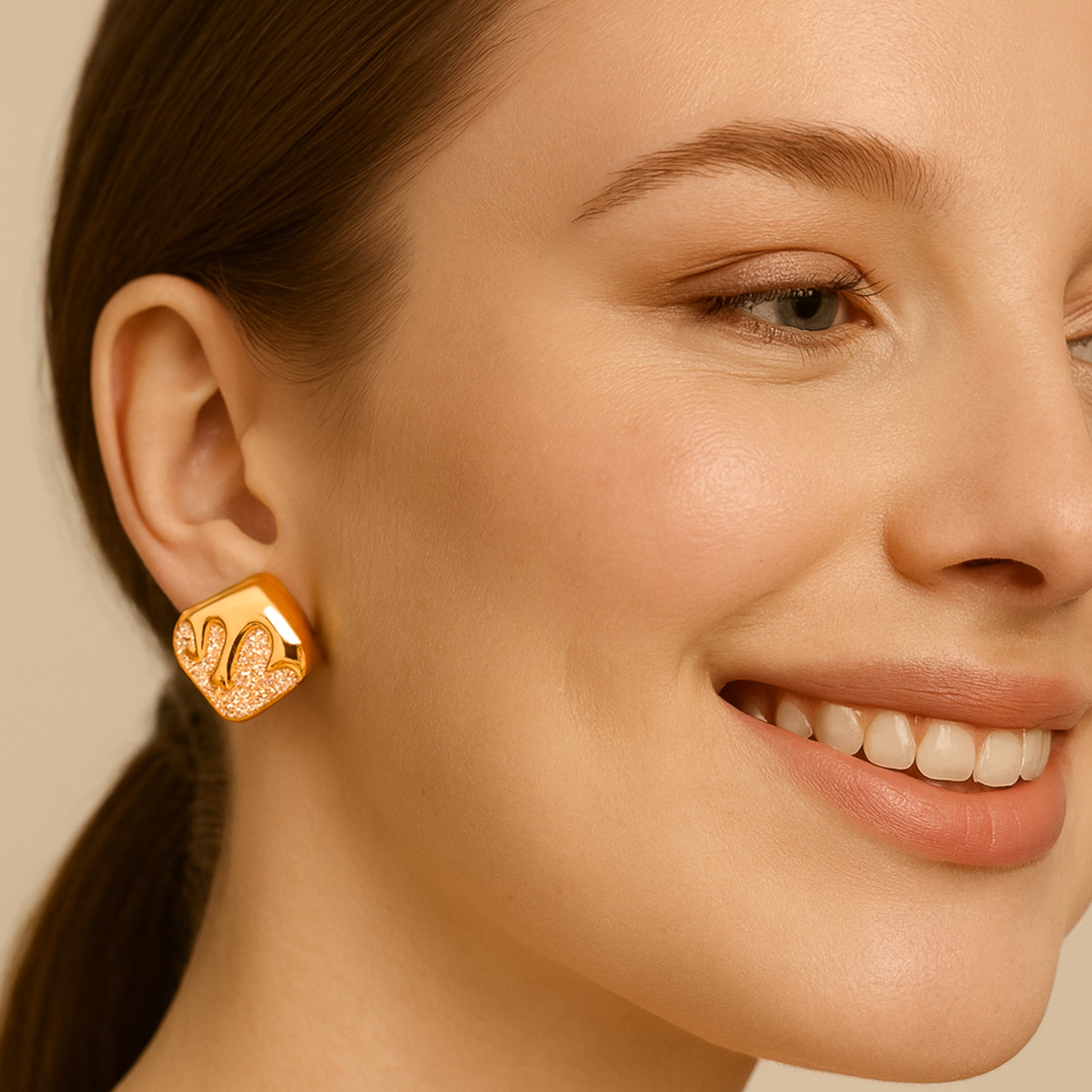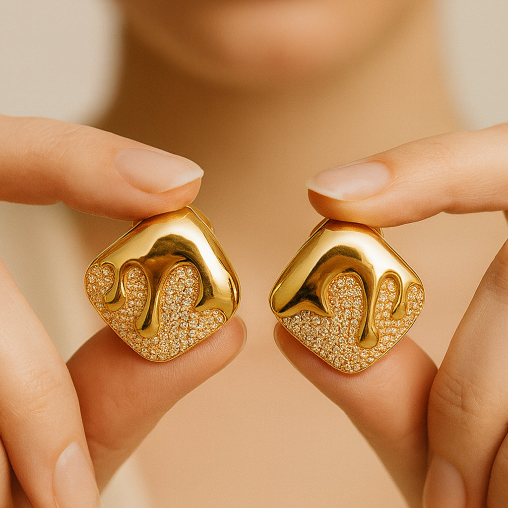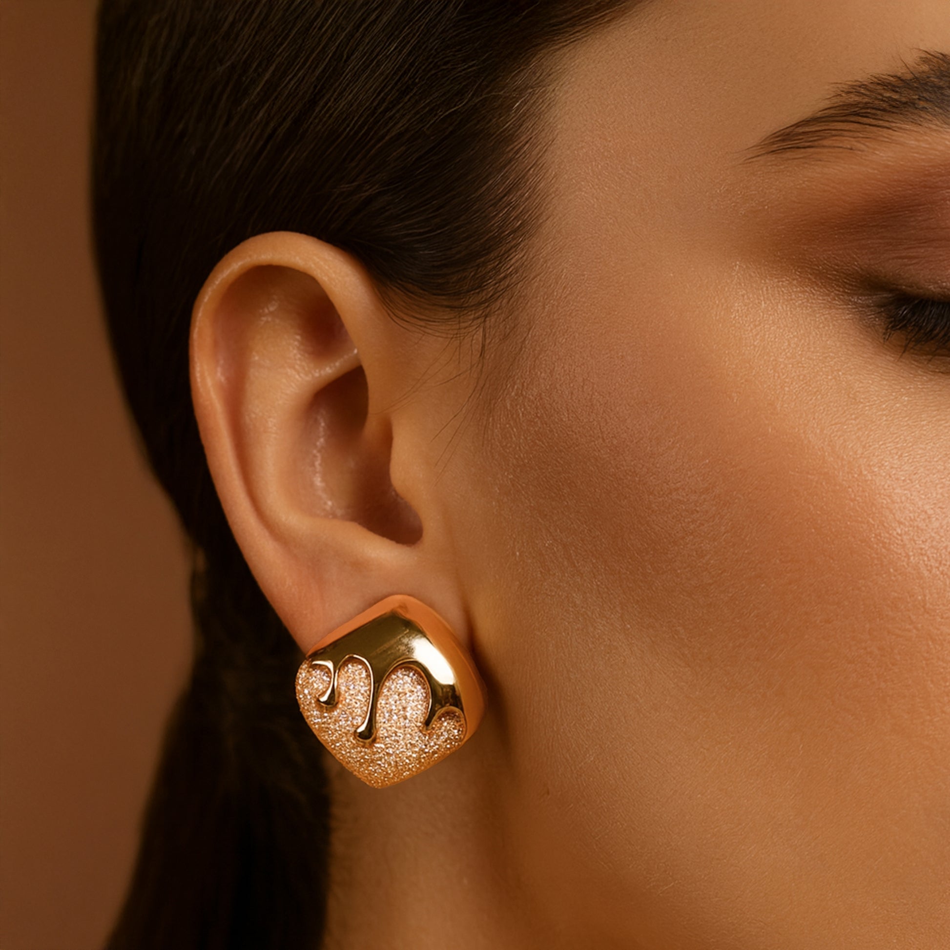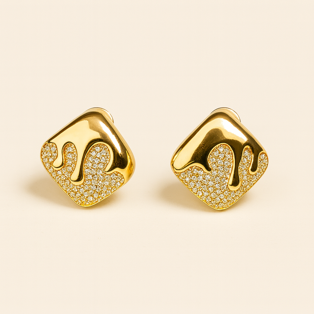 The Melting Gold & Faux Diamond Studs come with a unique molten-gold effect flowing seamlessly into a shimmering bed of faux diamonds, creating the illusion of liquid metal captured mid-drip. The smooth, high-shine gold plating contrasts beautifully with the subtle sparkle of the stones, giving these studs a sophisticated yet artistic vibe. Compact in size but big on style, they’re perfect for elevating everyday outfits or adding a polished finish to your evening look. Lightweight and comfortable, they’re the kind of versatile earrings you’ll reach for whenever you want effortless glamour.