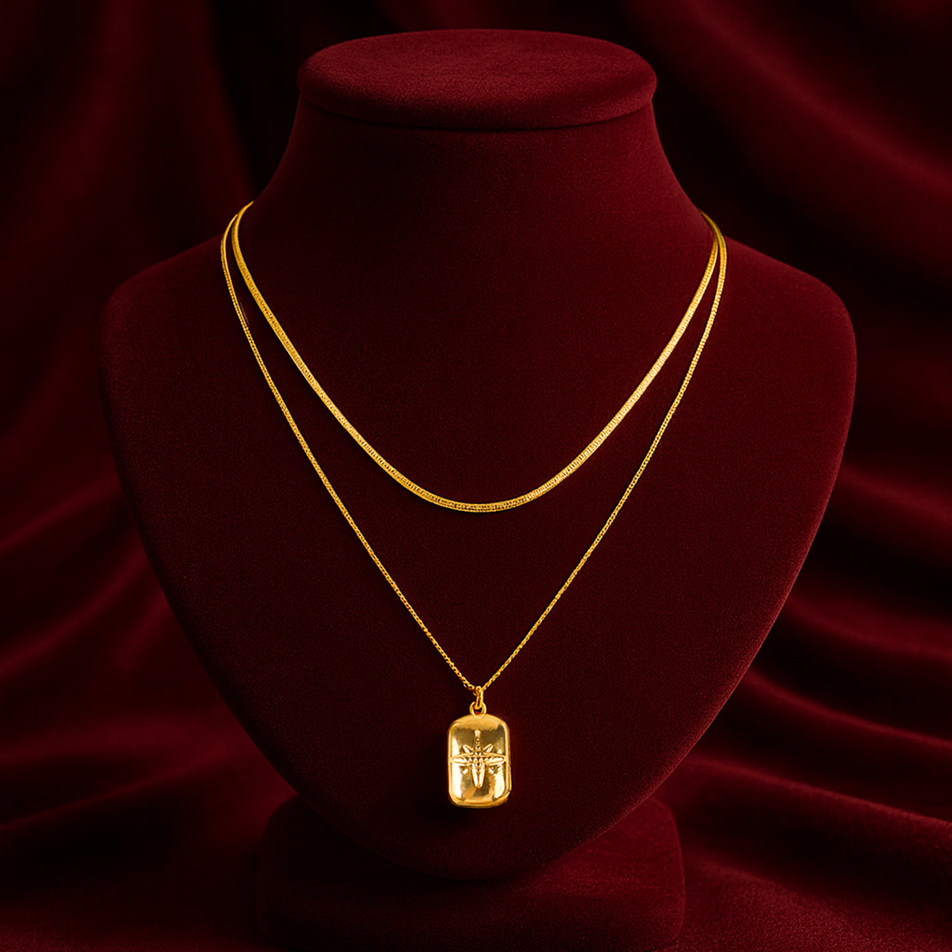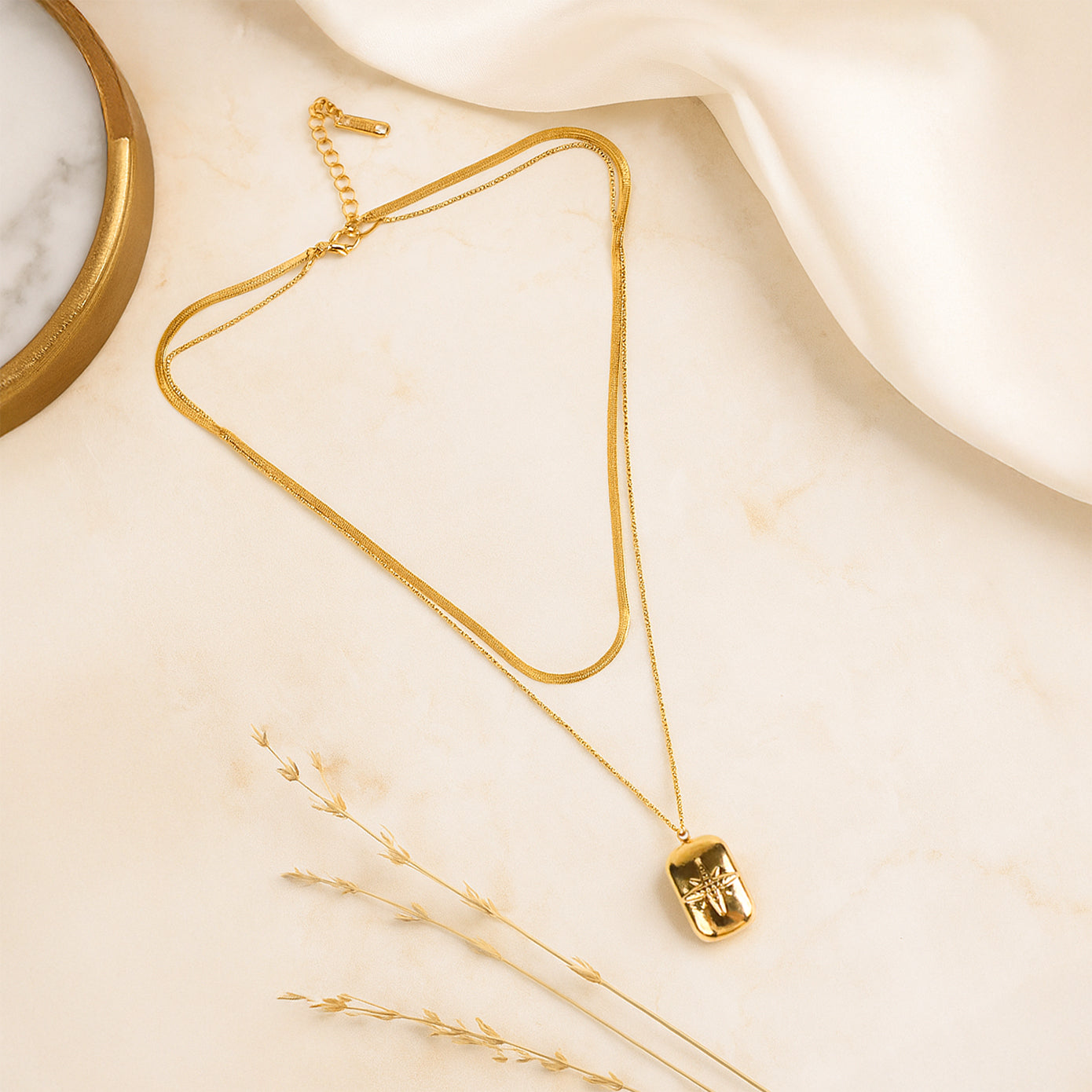 Layered with attitude, finished with intention - this sharp, multi-strand necklace features a gem-encrusted rectangular pendant etched with star-like details. Clean lines meet a celestial vibe, in a delicately crafted necklace made with lightweight & irritation-free materials. North Star is the perfect contrast piece for structured silhouettes, leather layers, or bare skin because it doesn’t whisper - it simply declares.
