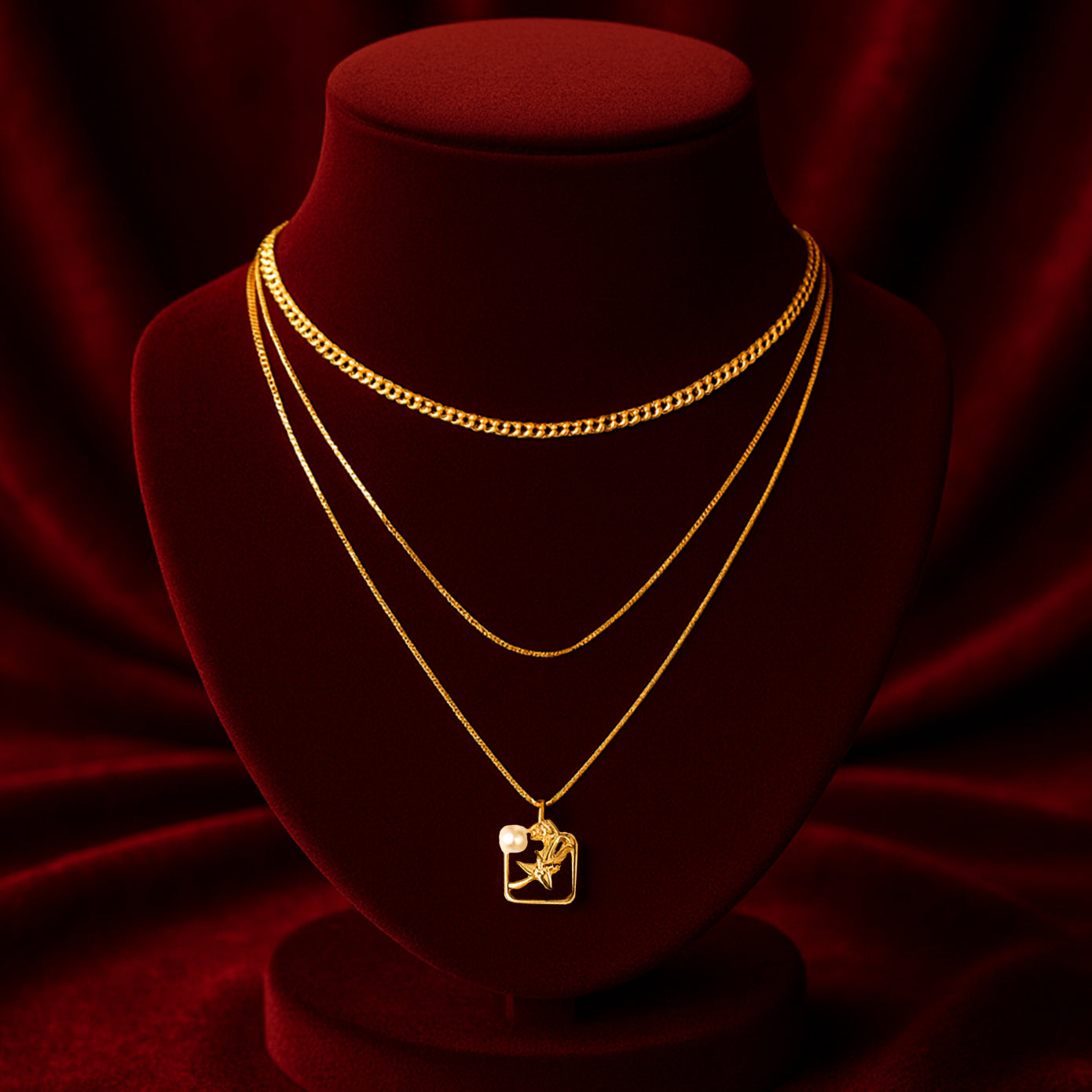 Soft meets structure in Pearly Rose - a striking layered necklace featuring fine gold-tone chains and a rose pendant suspended in clean rectangular lines. A single pearl punctuates the design, adding contrast and quiet drama. Crafted with premium materials that are both lightweight & irritation-free - it’s a romantic piece with a bold personality - perfect for moments when softness needs an edge.
