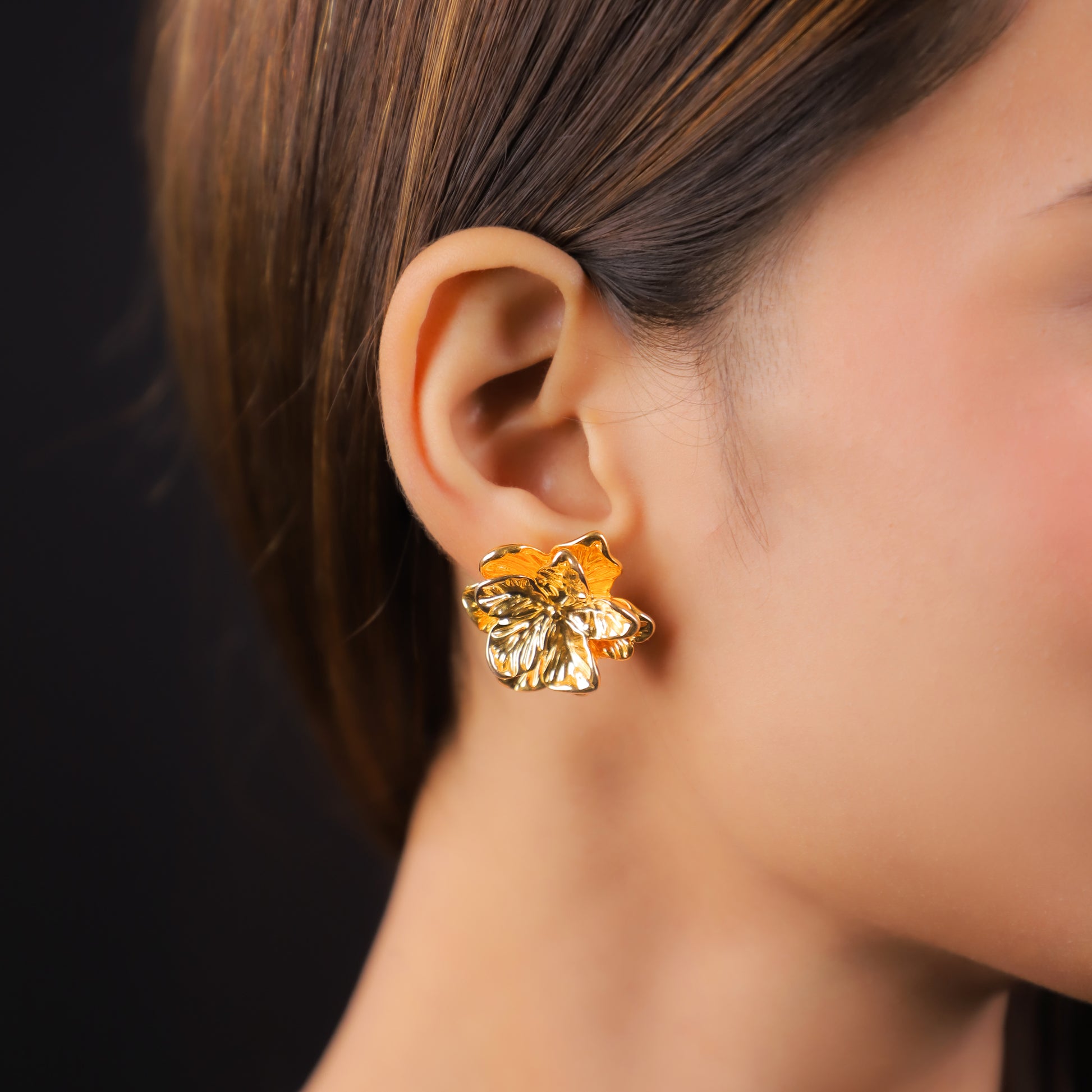 Crafted in a rich rose gold finish, each petal is sculpted with a soft, organic texture that catches light from every angle. Whether you're dressing up for a festive evening or just adding a golden touch to a simple outfit, these floral studs bring a refreshing bloom to your look.