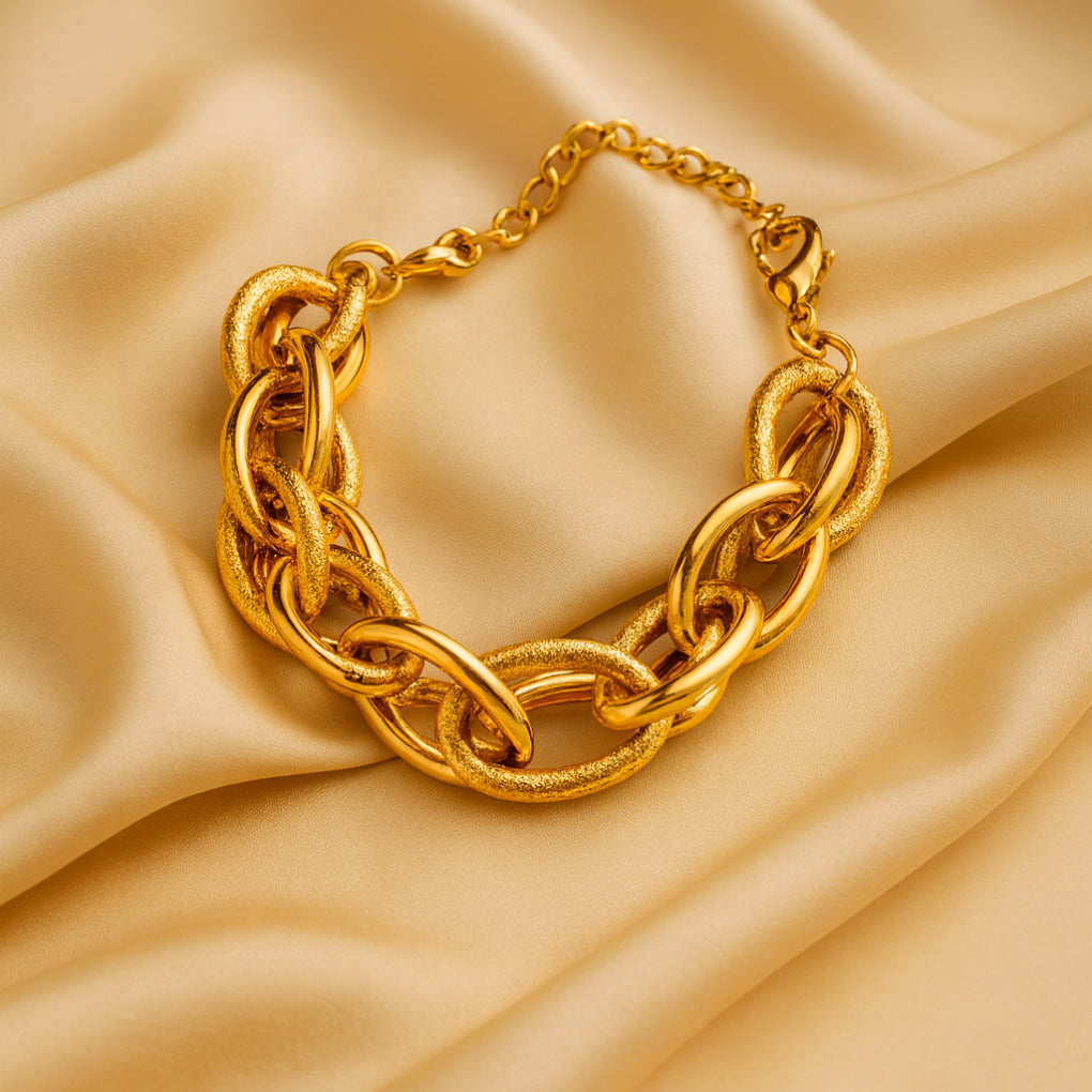 Turn up the attitude with Golden Link Power Bracelet , a chunky gold chain bracelet that doesn’t play it safe. Featuring oversized textured and polished links, this piece brings bold energy to any look - no stacking necessary. The gleaming finish and industrial edge make it your go-to for off-duty cool or after-dark glam. Finished with a secure clasp and extender for the perfect fit, own the moment - loud and unapologetic.