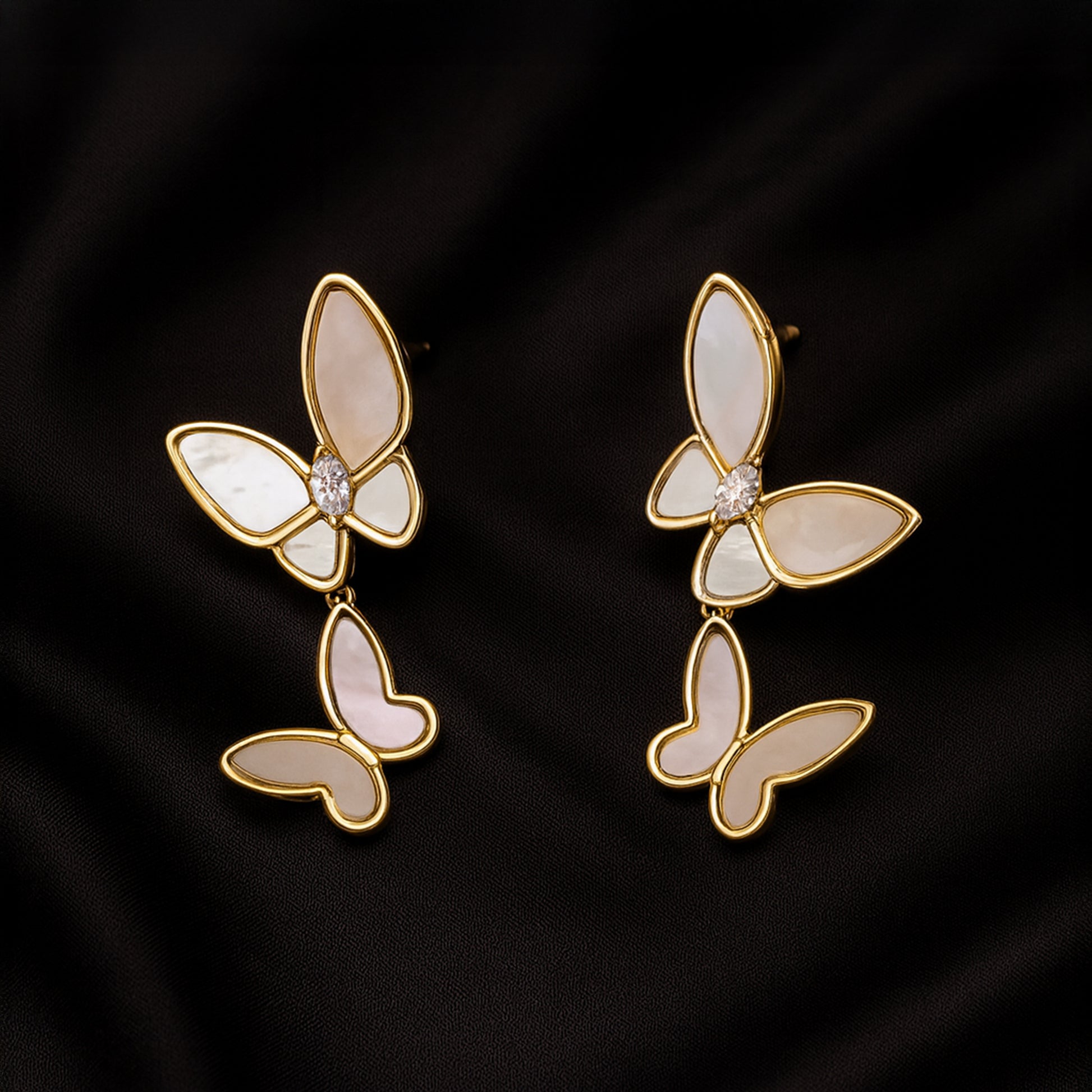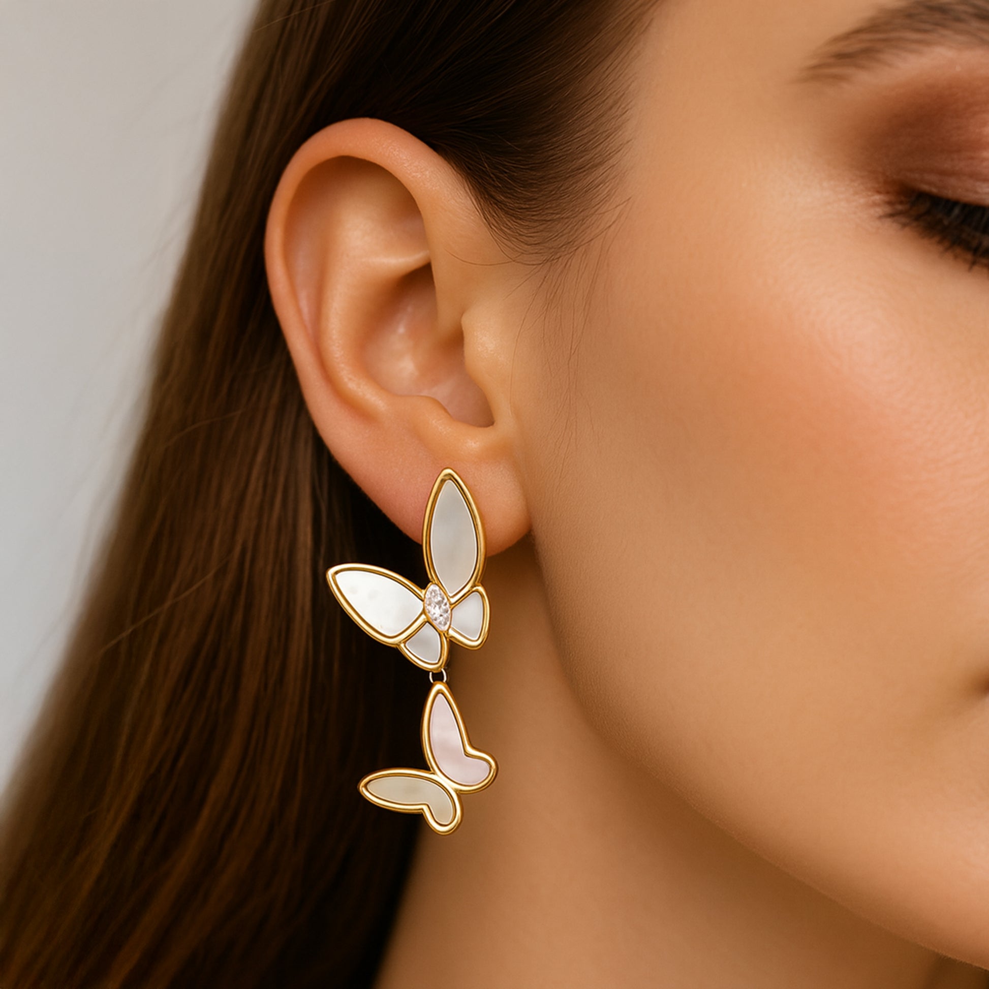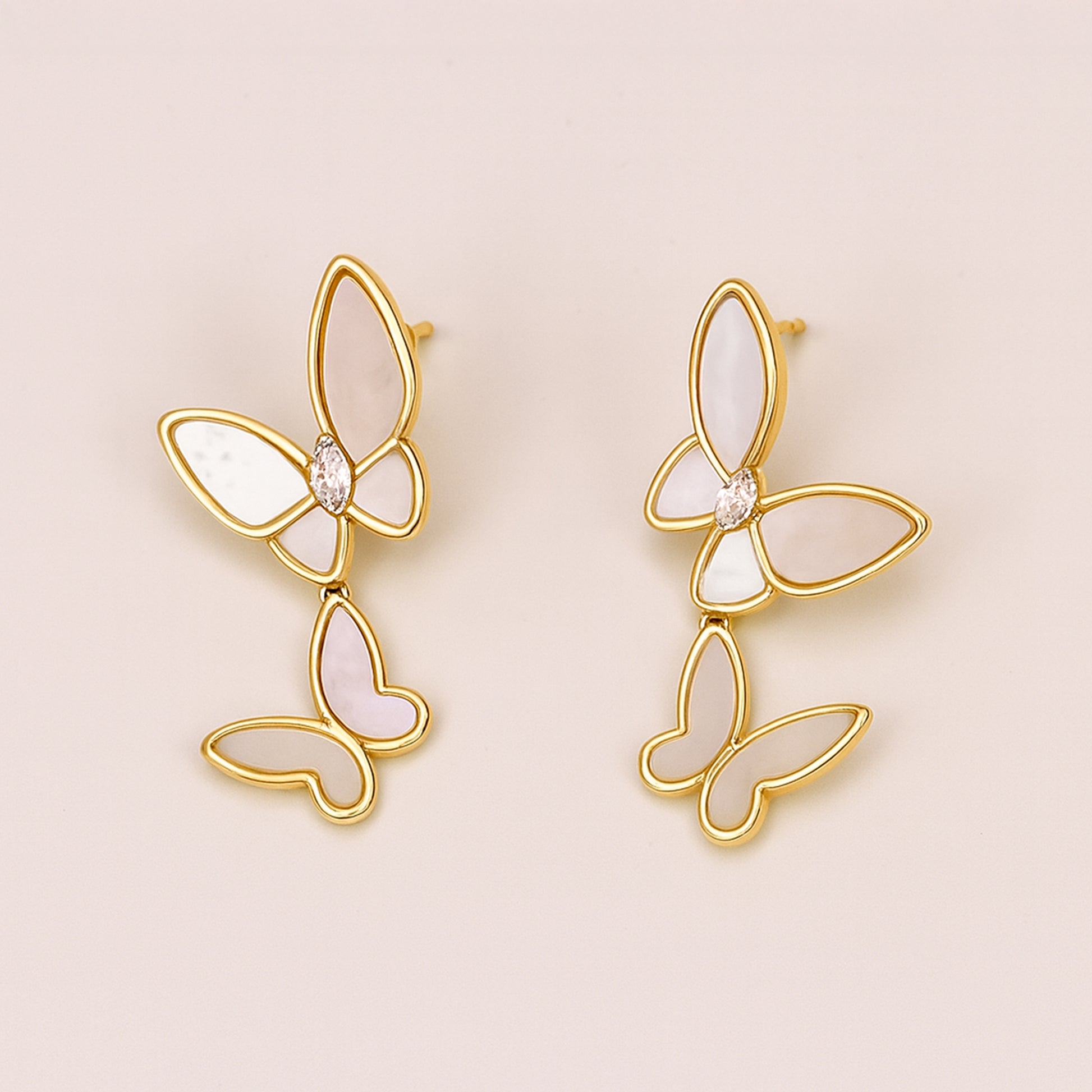 Graceful, delicate, and undeniably charming - the Starlit Butterflies Drop Earrings capture the magical beauty of fluttering butterfly wings. Crafted with fine attention to detail, these drop earrings feature a cascade of butterfly outlines in a sleek golden finish, creating a light, airy silhouette that moves beautifully with you. Their versatile design makes them perfect for both casual brunches and evening soirees, adding a hint of playful elegance to any outfit.