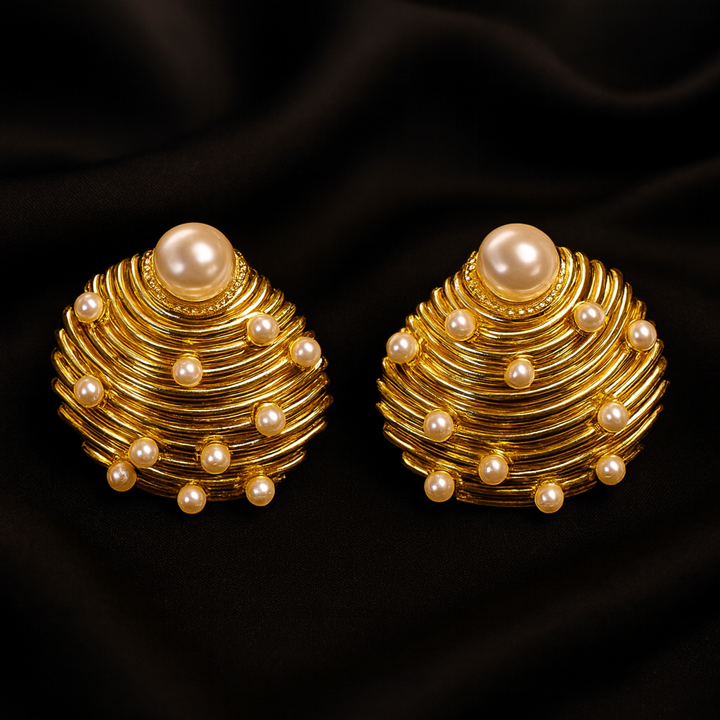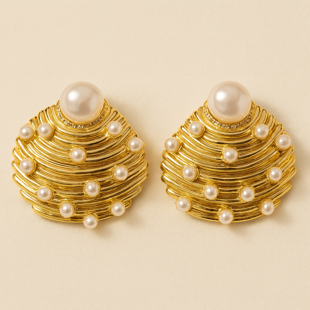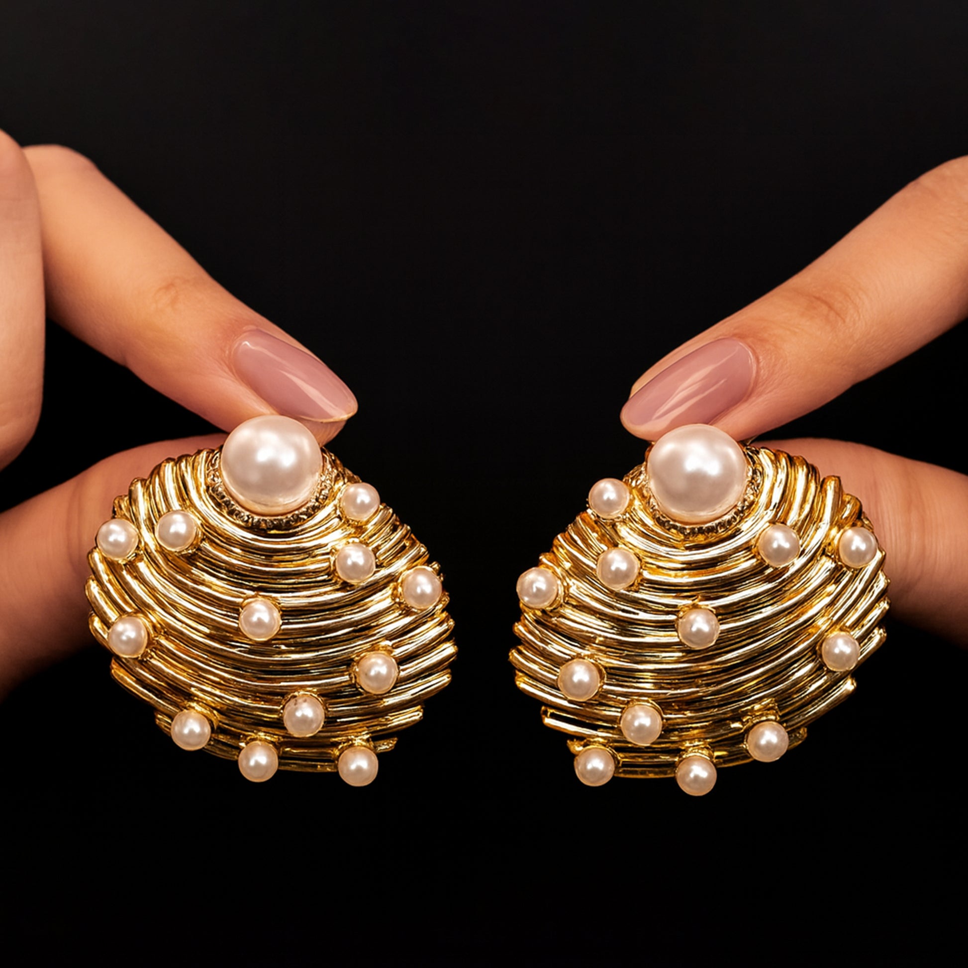 The Pearly Shell - Statement Stud Earrings bring a touch of seaside charm to your style. Designed in a layered shell shape with a radiant gold finish, they’re dotted with tiny pearls and crowned with a single larger pearl on top. Bold yet elegant, these earrings are perfect for when you want your accessories to do the talking - whether you’re dressing up for a special occasion or adding some sparkle to your everyday look.